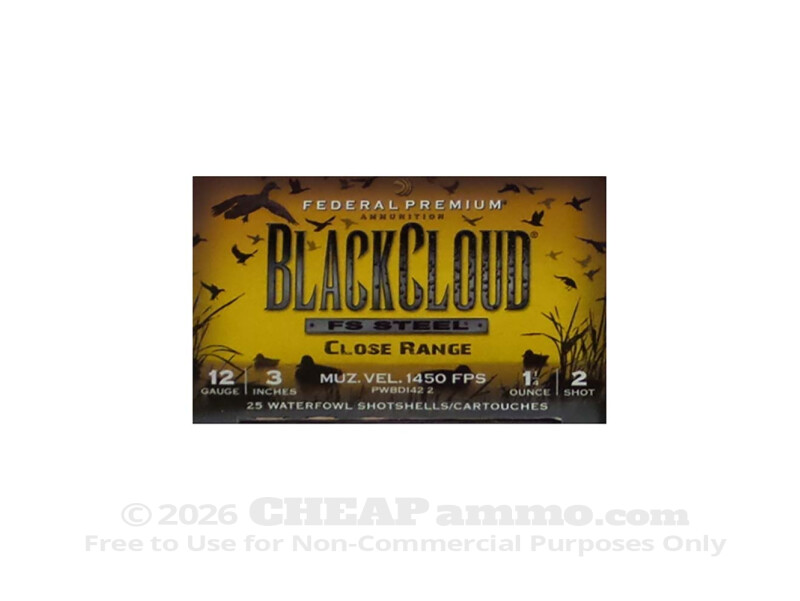 Federal Black Cloud 12 gauge ammo is some of our most sought after ammunition for taking down ducks. Lowland or wetland bird hunting now requires steel shot instead of lead in many if not all districts. Federal Black Cloud is among the first to accommodate the legislated use of said shot without it destroying the barrel: superior wadding holds the shot together and away from scouring the bore before exiting the barrel and spreading out as the choke dictates. Steel shot does weigh less and consequently has more shot per ounce, it also tends to not spread as readily as lead, remaining more concentrated at close range.