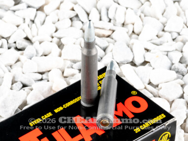 The 62 grain jacketed hollow point bullet by Tula exits the muzzle at 3025 feet per second with over 1300 foot pounds of energy. As it is heavier than the more common 55 grain, it is suitable for varmint hunting and target practice out of lower twist, such as 1:8 or 1:7, barrels.