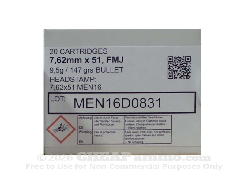 MEN Full Metal Jacket (FMJ) 147 Grain 308 Winchester (7.62X51) Ammo - 500 Rounds