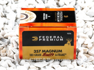 The 180 grain jacketed hollow point 357 mag ammo by Federal has a muzzle velocity of 1130 feet per second and can hit with up to 510 foot pounds of energy. While an acceptable choice for personal defense, the round is marketed towards sport hunting.