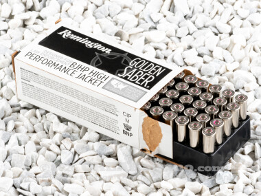 Since Smith & Wesson’s introduction of their .38 Special ammo at the end of the 19th century, the cartridge has gone on to become one of the most prevalent revolver cartridges in the US. Used as the parent case, and economical and comfortable practice round, of the .357 magnum, the caliber itself has long offered reliable personal protection to both lawman and citizen alike. Remington’s Golden Saber 125 jacketed hollow point has a muzzle velocity of 975 feet per sec with 264 ft pounds of energy. This is a +P cartridge and should not be fired in chambers not rated for the increased powder charge. This is intended for personal and home defense: offering impressive results in a reliable, wheelgun platform.
