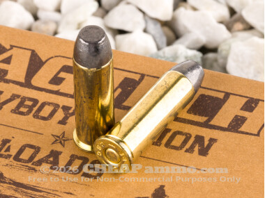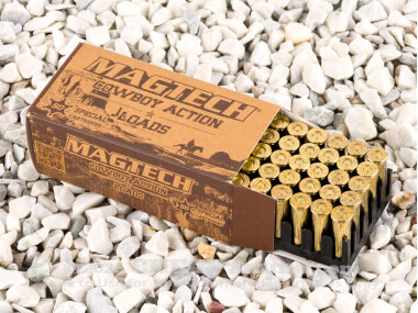 Magtech’s 158 grain flat nosed bullet has a muzzle velocity of 800 ft per sec with 225 ft lbs of energy. The flat front of the bullet also makes it a good choice for use in cowboy action carbines and rifles where it will not set off the next cartridge’s primers as a result of recoil or rough handling.