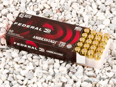 American Eagle's 230 grain, full metal jacket 45 ACP ammo has a muzzle velocity of just under 900 feet per second with 400 foot pounds of energy. It is ideal for target shooting and in a pinch, not an inconsequential defense round given that it will not over penetrate as is typical of other FMJ rounds. With this product, you'll get a full case of bulk 45 auto ammunition that's divided up in twenty individual boxes, with each box containing 50 rounds ready to fire.