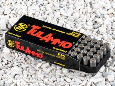 Tula's 230 grain full metal jacketed round exits the muzzle at 850 feet per second with approximately 350 foot pounds of energy. It closely mimics the ball ammunition in military service, but is designed with range and training applications in mind.