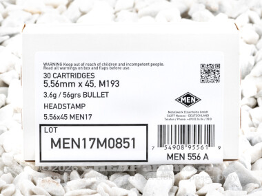 As 5.56x45 NATO ammunition is standard to up to 29 participating nations, it is not surprising that there is a wide array of manufacturers not only among those countries but also within. Since its adoption in the 1960s, the 5.56x45 has undergone several revisions, but the most common is the M193 round and the prefix M meaning it is acceptable as military standard or XM meaning it was not, for some reason or another. Manufacturing overruns of either are often sold onto the commercial market. The 56 grain full metal jacket round by MEN has a standard muzzle velocity of 3248 feet per second with 1300 foot pounds of energy. This 510 round case lot is ideal for use in any upcoming training courses or competitions or simply keeping on hand for civil defense or plinking.