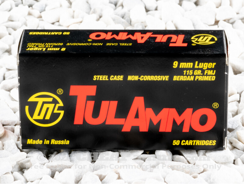 Tula's 115 grain full metal jacket 9mm ammo is a perfect choice for the economical shooter who is looking for a lot of ammo for the money. These rounds drive a bullet with a nominal muzzle velocity of 1150 feet per second and around 360 foot lbs of energy.