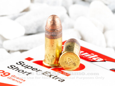 Perfect for handling those pesky varmints and pests, the 22 Short cartridge is a classic "small round". With a long history dating back to the mid-1800's, the round has been an integral part of shooting from smalltown county fairs to the Olympic games. The 29 grain copper plated bullet by Aguila has a muzzle velocity of 1095 feet per second with 104 foot pounds of energy. This is ideal for target shooting, including in those equipped with silencers as the copper plating reduces fouling within the baffles.