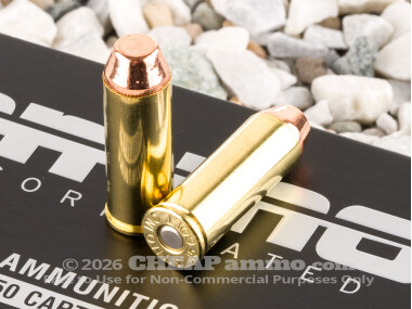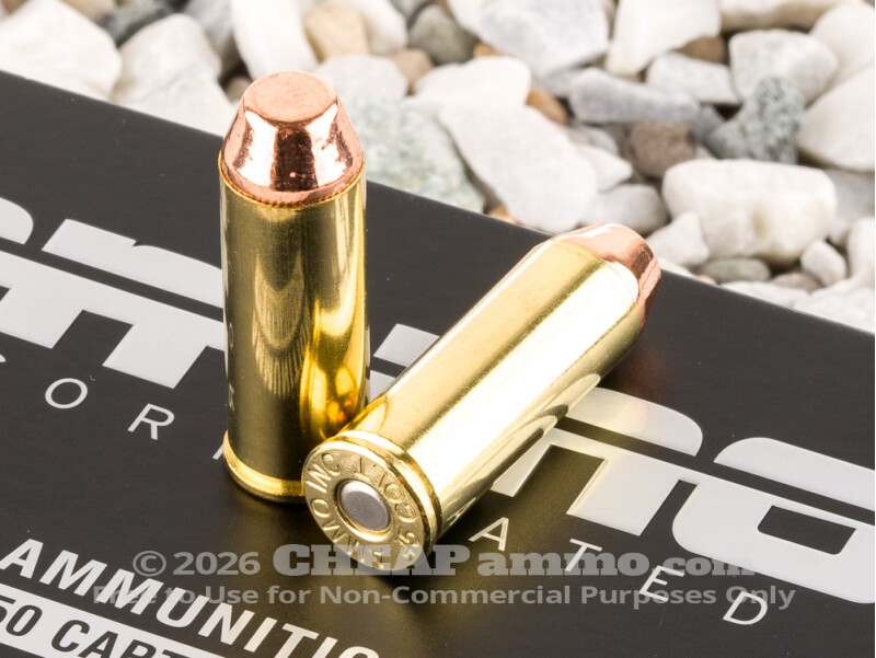 This round’s 250 grain total metal jacket projectile offers the same ballistic and terminal performance as any conventional FMJ. The TMJ’s advantages all reveal themselves while the bullet is still rocketing down the barrel. Thanks to its copper-alloy jacket – which completely envelops the bullet instead of leaving its core’s base exposed to hot propellant gasses – the TMJ will not produce vaporized lead throughout ignition. No lead gas for you to breathe in. No lead gas that will accumulate on your barrel as fouling.