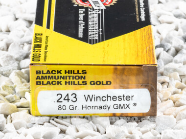 .243 Winchester ammunition was introduced in 1955 from a necked down .308 Winchester round. The process of taking standard .30 caliber rifle rounds and reducing the bullet diameter was intended to create a higher velocity, flatter shooting, deeper penetrating round, and the .243 is no different. Remarkably versatile with under 90 grain bullet weights being ideal for long range target shooting and varmint hunting and heavier weights being suitable for deer hunting, the .243 remains very popular with hunters of smaller stature (beginners) or others who are disinclined to the heavier recoil of the standard calibers. The 80 grain, poly tipped, Black Hills Gold bullet has a muzzle velocity of 3225 feet per second with 1847 foot pounds of energy. It is right on the cusp of a deer cartridge or a small to medium game, so depending on range, it is a very good universal round in this caliber.