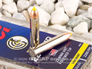This round’s light 30 grain bullet hauls out of a rifle barrel at a velocity of 2,200 fps. The precision-built polymer tip minimizes drag so the bullet can conserve more of its momentum downrange. At 0.116, the VNT’s G1 BC is sufficient to let it reach 100 yards with 164 ft lbs of rodent-eradicating energy!