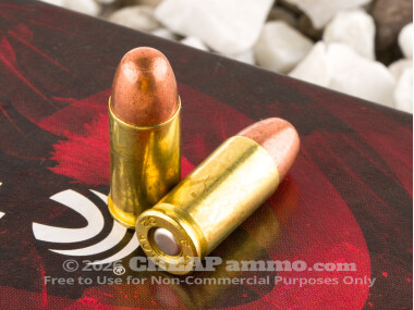 This is pure target ammo, loaded with 71 grain round nose profile full metal jacket projectiles. While it is true that 32 ACP bullets often fail to show any terminal expansion even when they are designed for it, the FMJ cannot expand by design. The FMJ has a lead core and copper alloy jacket (i.e. nonmagnetic). It chambers reliably, minimizes lead fouling, and achieves 900 fps muzzle velocity in conjunction with a 4” barrel. At 100 yards you’re looking at a velocity of approximately 800 fps.