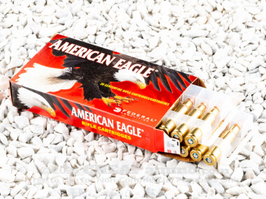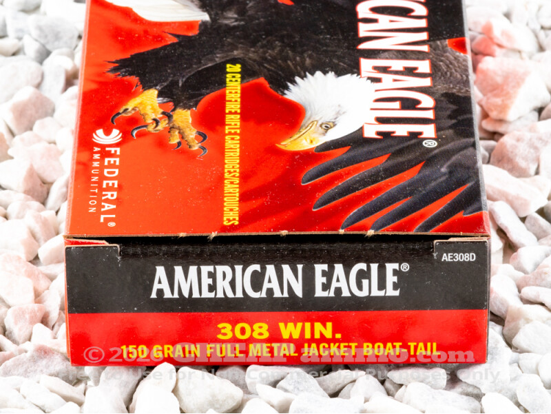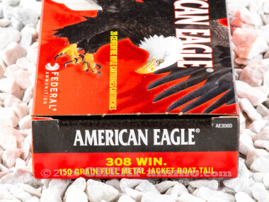 Ready to shoot the wings off of flies downrange, Karate Kid style? Then Federal’s American Eagle label has got the 308 Win ammo for you! This cartridge features a 150 grain projectile with a boat tail base. It helps the bullet to avoid creating unnecessary turbulence while in flight, flattening its trajectory and helping it to preserve a greater portion of its speed farther downrange. This bullet’s full metal jacket won’t permit its lead core to paint the inside of your bore with residue, and its toothed cannelure prevents setback that could impact accuracy.