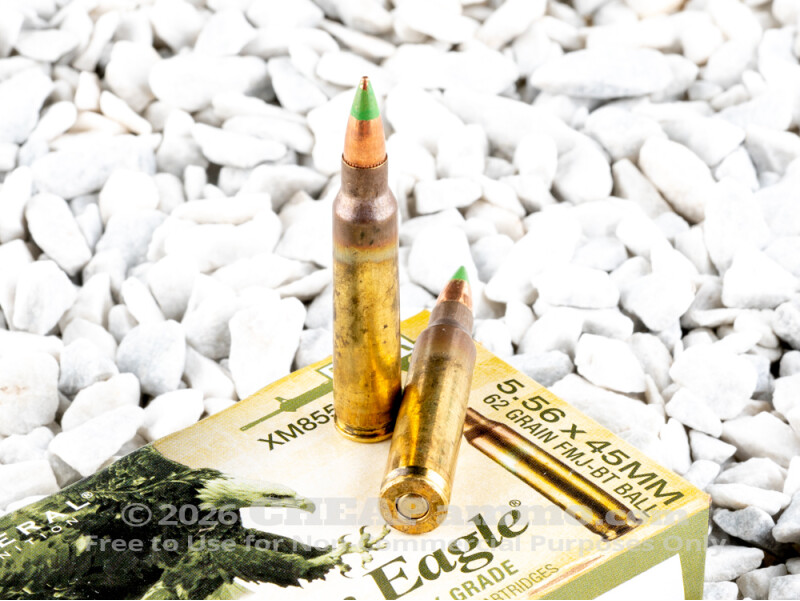 This 5.56x45 cartridge by Federal is designated as an XM855 (the “X” prefix simply means it’s not meant for military use). As an XM855, the round’s 62 grain projectile has a green tip that indicates its lead core is strengthened by a steel penetrator. The bullet’s design is built to penetrate barriers like steel plating and light body armor. This round’s bullet further sports the full metal jacket that’s indispensable for high volume shooting, as it prevents rapid bore fouling, as well as a boat tail design. With its tapered base’s superior ballistic coefficient you’ll find this round’s bullet’s trajectory to stay flatter and deliver greater energy upon impact downrange.