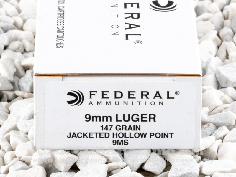 The 147 grain jacketed hollow point bullet by Federal has a muzzle velocity of 1000 feet per second with 326 foot pounds of energy. It is often selected by law enforcement agencies specifically to reduce instances of over penetration and/or ricochets. Designed to hit and stop, transferring all of its energy into the target.