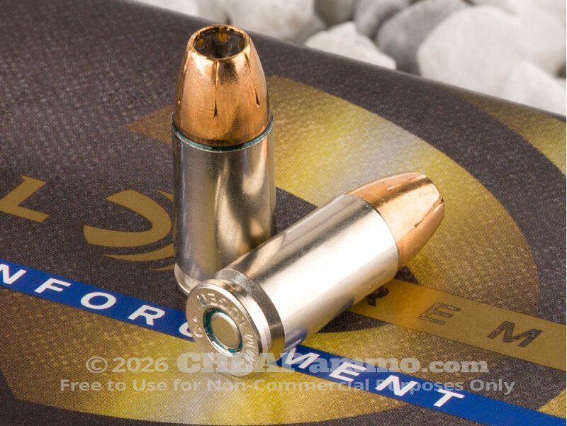 This 9mm cartridge from Federal’s Law Enforcement line of ammunition features a 124 grain HST projectile. A cannelure in the HST’s shank mechanically binds its jacket and core together, enabling it to retain virtually 100 percent of its weight -- even if it must first pass through one of a variety of common urban barriers en route to its target. The HST’s coaligned core and external jacket skives both enable it to expand greatly during penetration, and its nose cavity is is designed to avoid becoming clogged with debris for reliable terminal performance. That this bullet avoids overpenetration so well makes it ideal for self-defense where bystander safety is an issue.
