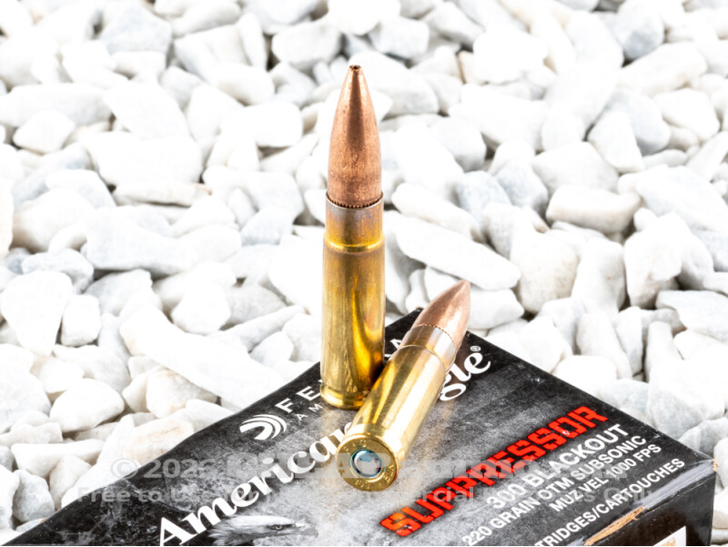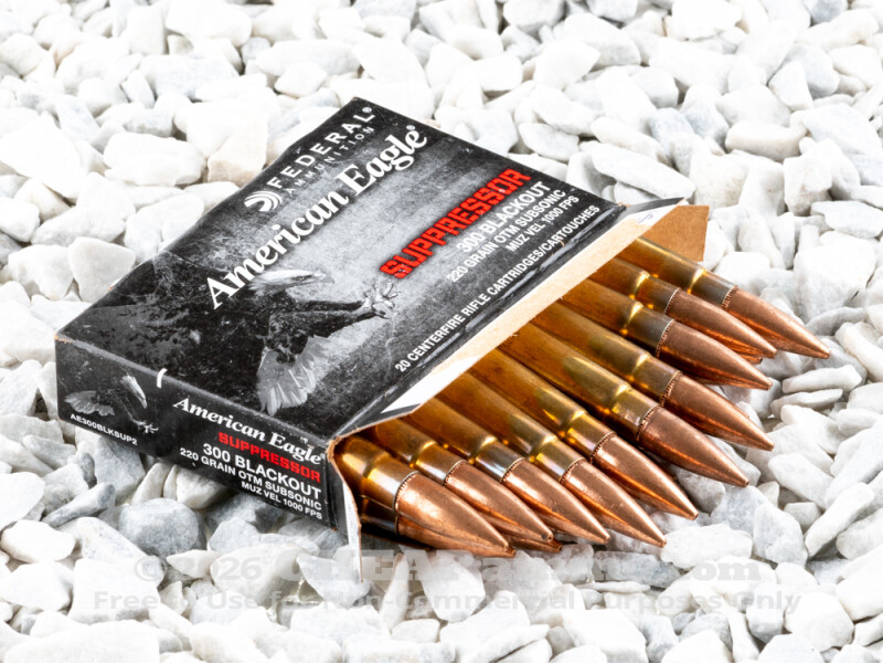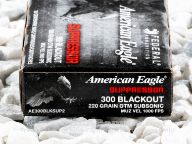 Perfect ammo for a suppressed 300 AAC Blackout firearm! Federal Premium’s American Eagle Suppressor series 300 BLK ammunition is loaded with the long, heavy 220 grain bullets requisite to generate standard chamber pressure while delivering a low, low muzzle velocity of 1,000 fps. That’s ~125 fps slower than the speed of sound, so you’re bound to notice an astoundingly subtle report even if you’re not firing through a can!