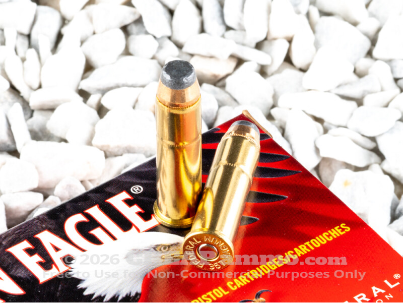 Much can and has been said for the flexibility of the .357 Magnum, and with very good reason. It is capable of firing all the intermediate rounds between the economical and novice friendly .38 sp through the +P et al rounds to itself making it the perfect jack of all trades firearm available. And if the continuing production of new designs of the "antiquated" wheel gun is any evidence, shooters agree without reservation. Federal's American Eagle brand is keeping up with the demand with this 158 grain JSP round that serves as a perfect balance of penetration and expansion. Reaching muzzle velocities in the 1240 feet per second range with 530 or more ft lbs, it is perfect for both hunters and for self-defense. Further, the bullet shape is ideal for safe use in tube fed carbines, and worry free feeding in lever actions.