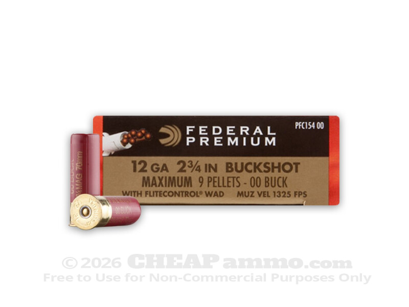 Federal’s Vital Shok 2.75” shell is loaded with nine 00 buckshot lead pellets measuring .33” in diameter. They are loaded into a Flitecontrol wadding to maintain a tight pattern with a muzzle velocity of 1325 feet per second. Delivering the equivalent of nine shots from a .32 ACP or better in a single blast makes this an ideal home defense shell as well as being suitable for deer hunting.