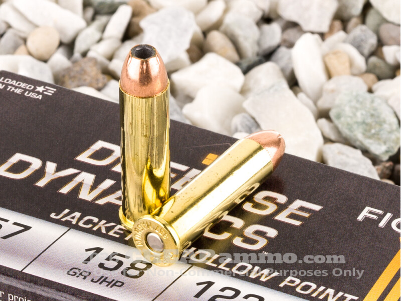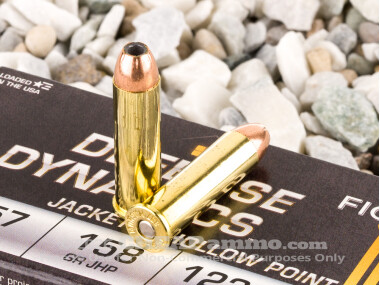 Fiocchi loads their Defense Dynamics series ammunition for one specific application. We’ll let you guess which one. This round’s 158 grain jacketed hollow point will slam into a close-range target with about double the minimum energy recommended for self-defense. Its lead core’s deep nose cavity and copper jacket’s notched rim work in tandem to deliver rapid terminal expansion. And thanks to its concave nose profile, the JHP is also safe to load in a lever-action rifle’s tubular magazine.