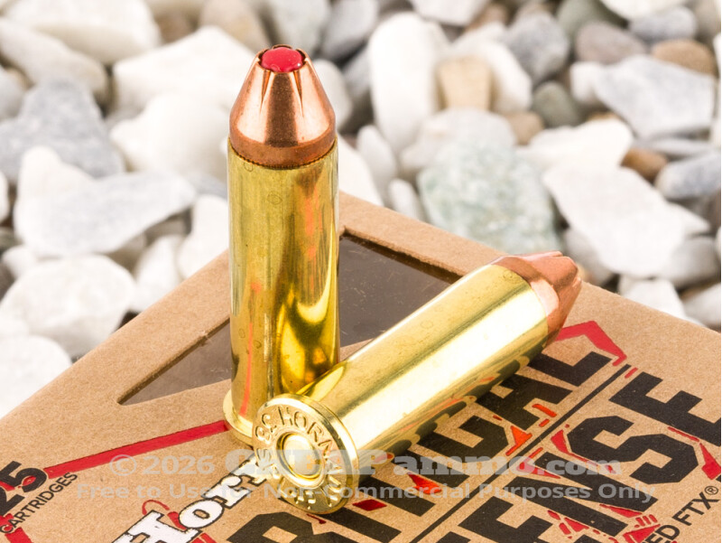 For aficionados of the reliable wheelgun, Smith & Wesson’s .38 Special cartridge remains the most popular, especially for owners of .357 Magnum firearms. The caliber was introduced in 1899 as an upgrade for the .38 Long Colt with S&W’s new swing out cylinder firearm. Since then, it became a primary caliber for law enforcement for decades and remains popular with private users because the caliber has an easy recoil and is renown for its inherent accuracy. The 110 grain flex tip bullet by Hornady has a muzzle velocity of 1090 feet per second with 290 foot pounds of energy. This is a personal defense purpose round which maximizes aerodynamics and expansion in target. The polymer tip is also safe for use in tube magazine carbines without fear of setting off the primers in front.