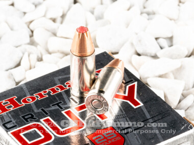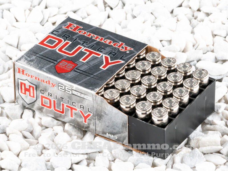 Hornady has been making quality sporting and defensive ammunition since the 1960’s and has become a trusted source for those who use their weapons on the job. The Critical Duty line is designed specifically for standard length barrels of 4”+/-, as opposed to short CCW barrels, to achieve an optimum balance of energy delivery into the target without tipping the balance into endangering anything around or behind the target. While it will function in short barreled carry concealed firearms, its full potentials are realized in primary carry weapons typical for law enforcement use.