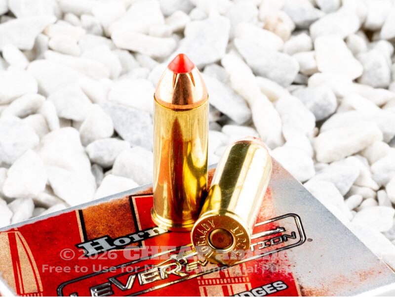 This 45 Long Colt cartridge by Hornady is perfect for the lever-action varmint hunter. A LEVERevolution round, it features a 225 grain FTX projectile with a Flex Tip. The soft spike of polymer absorbs shock while it’s sitting in a tubular magazine, ensuring that it won’t ignite the primer it’s butting up against. You don’t want your magazine to go kablooey just because you drop your rifle.