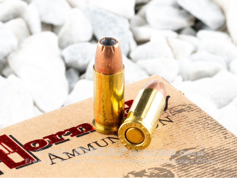 Hornady's 35 grain jacketed hollow point bullet has a muzzle velocity of 900 feet per second hitting with 63 foot pounds of energy. The eXtreme Terminal Performance (XTP) bullet bridges the gap between penetration and expansion and is therefore an ideal defense round for this caliber.