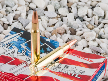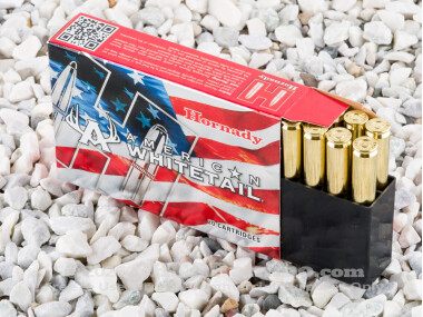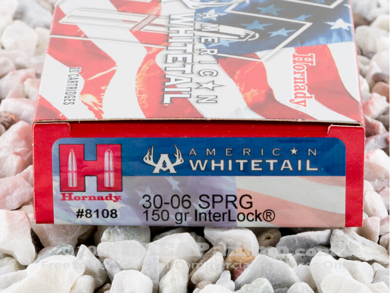 The .30-06 Springfield is a direct descendent of the .30-03 cartridge adopted by the US military in 1903. It may better be termed as a younger sibling as it uses the exact case as the 03, but uses a pointed or “spitzer” type bullet that proved to deliver more satisfying results at range. While a military round with the US for half a century it remains a popular sporting round all over the world, but most especially for American sportsmen for use on larger game. Additionally, it remains the caliber of choice for long distance military style target competitions. The American Whitetail brand, 150 grain bullet has a muzzle velocity of 2910 feet per second with 2820 foot pounds of energy. This is suitable for deer hunting, as the name implies, with soft point for controlled expansion and Hornady’s Interlock ring forged within the bullet to maintain mass for deeper penetration into the game.