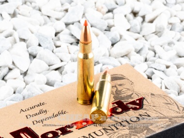This round is armed with Hornady’s specialized deer hunting bullet: the one and only Super Shock Tip. Its signature tip is made of hard polymer, which enables it to wedge deep into the lead core on impact and produce lightning-fast (yet carefully controlled) terminal expansion. Deep penetration is no challenge for the SST, as its one-piece core and thick, tapered copper jacket are locked together in two separate places: the cannelure, and the InterLock ring just behind it.