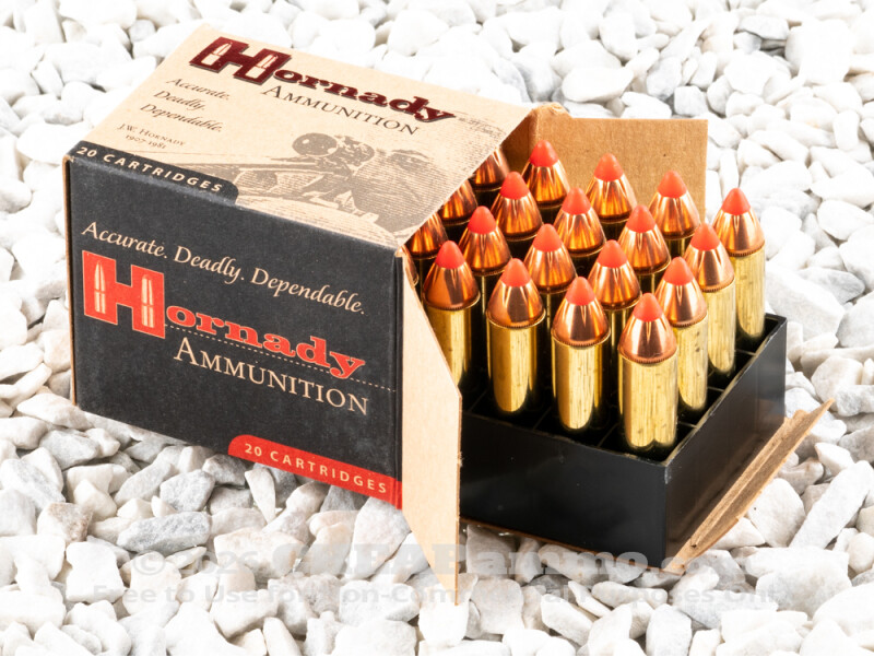 This 200 grain, poly tipped jacketed hollow point bullet by Hornady leaves the muzzle at 2200 feet per second with 2149 foot pounds of force. This is twice as fast as a .44 Remington Magnum with about three times as much energy (and, of course, recoil). This is primarily for hunting something that needs to be put down fast and preferably with one shot. The poly tipped bullet, however, is also capable of being safely fired tube fed carbines, …just in case.