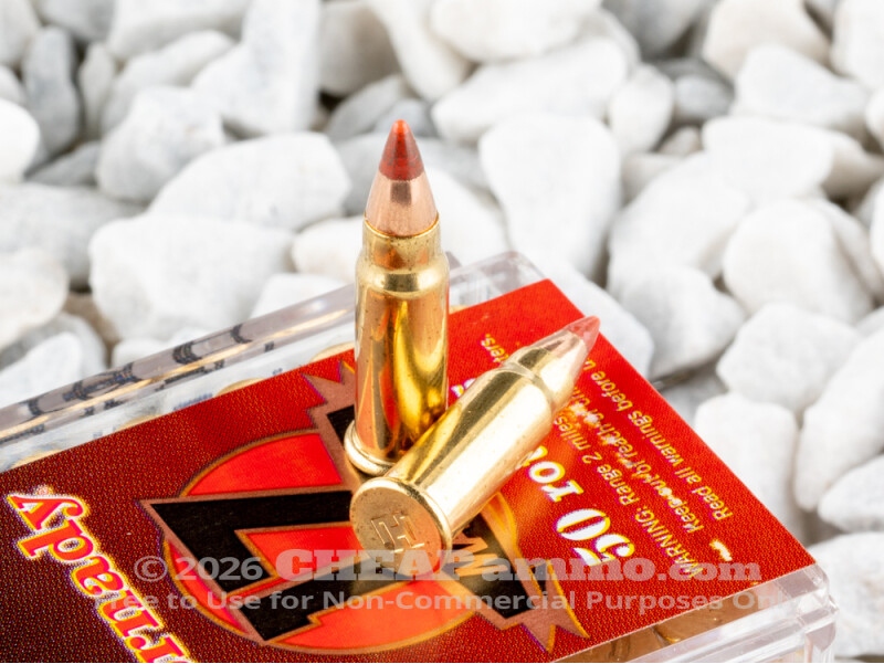 After the commercial success of the .17 Hornady Magnum Rimfire, the company released the .17 HM2, the Hornady Mach 2, based upon the necked down .22 LR. The idea is to have a lighter bullet able to hit radically higher velocities with a flatter trajectory, at a fraction of the cost and recoil of similarly performing centerfire cartridges. The 17 grain bullet has a muzzle velocity of approximately 2100 feet per second and over 160 foot pounds of energy. The full metal jacket offers superior accuracy to the target while the v-max tip is driven into the core of the bullet on impact giving impressive expansion. As such, this is a very sought after hunting round capable of taking down some of the most robust of varmints.