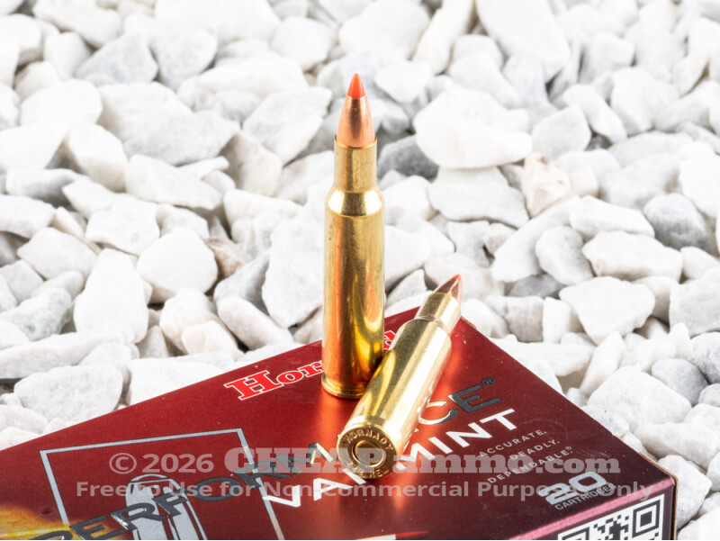 The 50 grain V-Max bullet by Hornady has a muzzle velocity of 3395 feet per second with 1242 foot pounds of energy. The V-Max is a polymer tipped hollow point bullet suitable for hunting: it is the perfect mix of ballistic efficiency to target and expansion to transfer all its energy into the target.