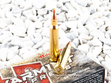Hornady’s 55 grain v-max bullet can leave the barrel at 3240 feet per second with 1282 foot pounds of energy. This is an ideal target shooting or hunting round and quite a bargain at 200 round bulk pricing. The polymer tipped bullet maintains aerodynamics while encouraging a consistent mushrooming upon entry.