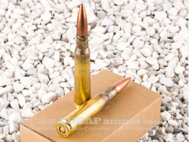 This ammo’s brass cases are gray and speckled around their necks and shoulders. They are still very much brand new – Lake City simply doesn’t bother to polish their cases after heat treating them for superior suppleness and reloadability. This non-corrosive ammo comes loose packed in a plain carton.