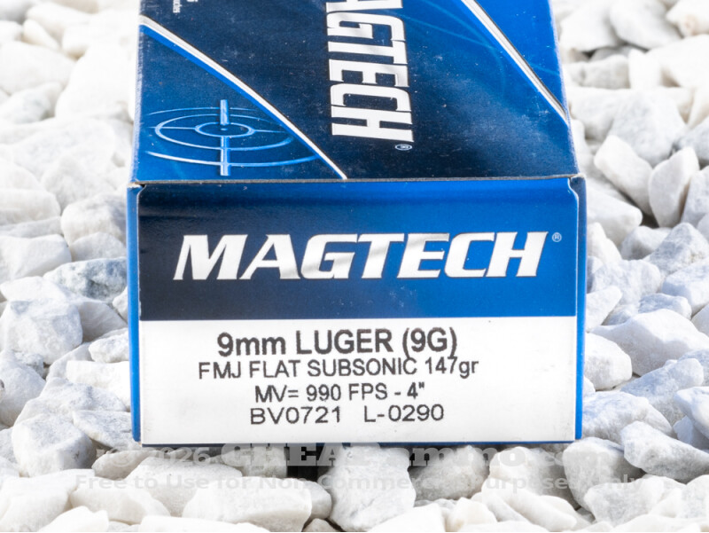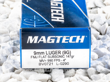 Magtech’s 147 grain jacketed flat nose bullet has a muzzle velocity of 990 feet per second with 320 foot pounds of energy. As a subsonic round, it is designed for use in firearms equipped with suppressors. However, many shooters have found that the heavy and “slow” bullet, with its flat nose, serves very well for accurate target shooting without a suppressor.