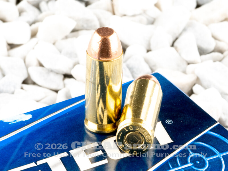 This cartridge gets straight to the point. Its 180 grain full metal jacket projectile bolts out of a 5” barrel at a velocity of 1,230 fps. That’s supersonic, and it’ll keep the bullet from dropping by more than 10” by the time it reaches 100 yards. The FMJ’s flat nose profile is common for 10mm bullets, and ensures reliable feeding in all semi-automatics. And before you ask, this ammo’s bullets do not contain steel and can’t attract a magnet.