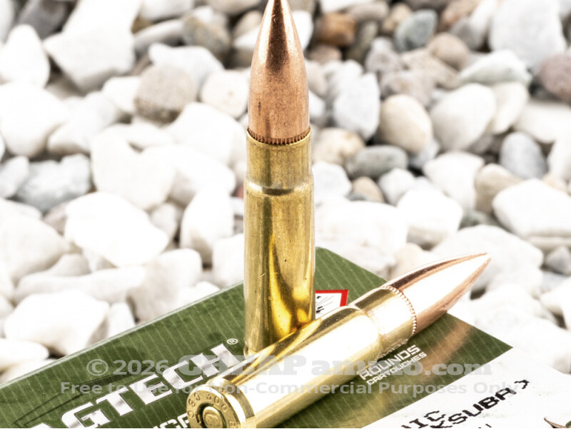 This 300 AAC Blackout cartridge features a 200 grain projectile, which is heavy for its caliber. The bullet’s full metal jacket makes it ideal for day long shooting sessions, as its ability to prevent the rapid accumulation of lead residue in your rifle’s bore means you’ll enjoy better accuracy for longer in between cleanings. That jacket further promotes certain feeding in magazine-fed weapons, and enables target penetration even at lower velocities.
