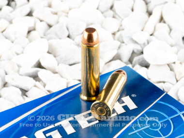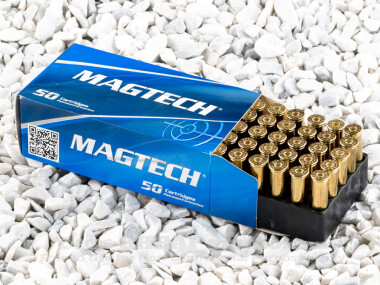The 1930’s saw American law enforcement searching for a higher performing cartridge than Smith & Wesson’s own .38 Special. In 1934 Smith & Wesson lengthened their proven .38 Special and included a larger primer to guarantee maximum powder burn. While developed for police work, the .357 Magnum is not a common law enforcement round today. Yet it remains a very popular choice among target shooters – competitive and casual – as well as for professional sporting hunters. Magtech’s 125 grain flat nosed full metal jacketed bullet has a muzzle velocity of 1405 feet per second with 548 foot pounds of energy. This is a good range training and target shooting round, even good for competitions. The flat nosed bullet is also a good choice for use in carbines that feed out of a tube magazine, a popular choice for medium game hunters. This bullet remains a good training option as the bullet has little to slow it down or transfer its energy into its target.