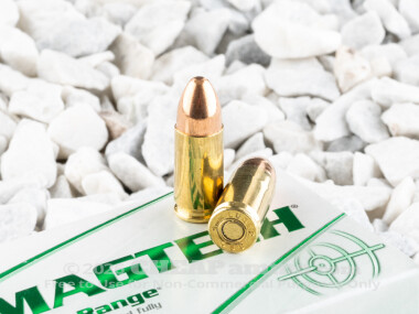 Magtech’s 124 grain fully encapsulated bullet has a muzzle velocity of 1109 feet per second with an energy output of 338 foot pounds. This is a target and range training round specifically designed with indoor range shooting in mind: the full jacketing prevents the escape of lead particles into the air when fired. The slight increase in bullet weight from the standard 115gr provides additional energy to cycle the action, which may help shooters with firearms that may be a bit finicky.
