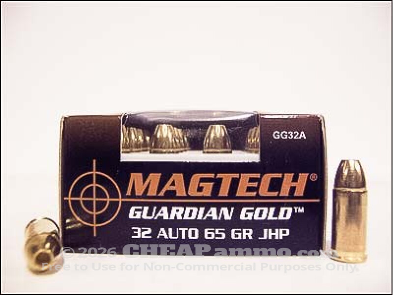 32 Auto ammo that's a good companion for your pocket pistol. The 65 grain jacketed hollow point (JHP) bullet by Magtech has a muzzle velocity of 922 feet per second with 120+ foot pounds of energy. This is certainly on the lower end of ballistic performances when compared to larger calibers, but for a small, palm sized "get off me" gun, it is certainly a bonus at the bargaining table.