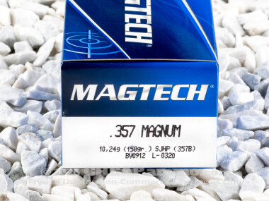 This 357 magnum ammo is loaded with 158 grain semi jacketed hollow point bullets by Magtech. That projectile leaves the muzzle with 1235 feet per second with 535 ft lbs of energy. This is a good all around cartridge for target shooting and range training while also offering peace of mind as a hunting and personal defense round. Further, the hollow point provides a flat front making the cartridge safe for use in carbines that tube magazine fed.