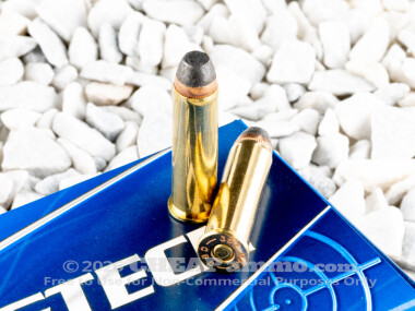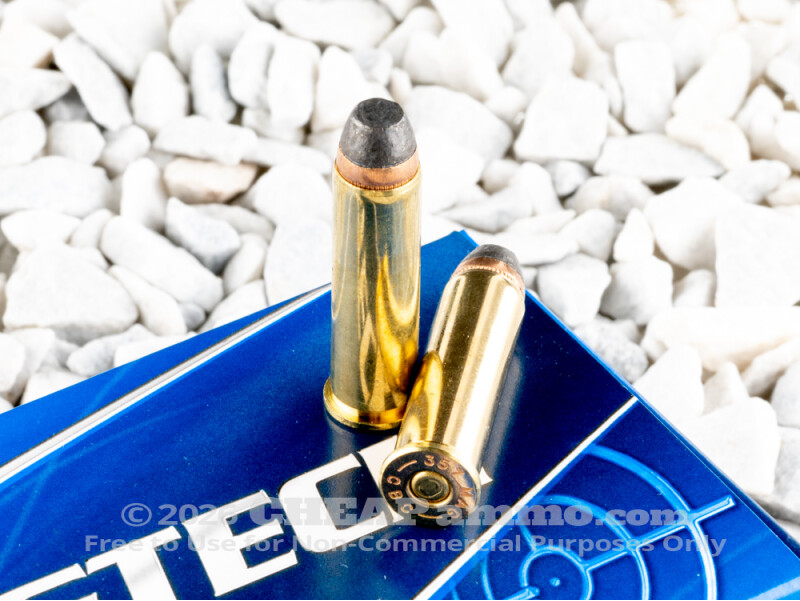 The .357 Magnum was introduced in 1934, born of a demand for a more effective round in dealing with the era’s bullet proof vests worn by high profile bank robbers. Individuals such as John Dillinger, who favored the Colt .38 Super. S&W’s contribution was to lengthen their .38 Special case for higher pressure loads for use in a revolver: which of course was what most lawmen were trained to use. The result was a very potent round that serves both lawman and hunter alike: in carbines or even revolcers the caliber is effective at close range for deer as well as coyotes. The semi jacketed soft point 158 grain bullet by Magtech has a muzzle velocity of 1235 feet per second with 535 foot pounds of energy. It is suitable for target and personal defense, especially where hollow point rounds may be restricted.
