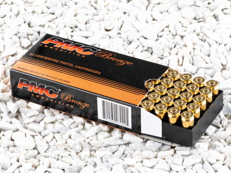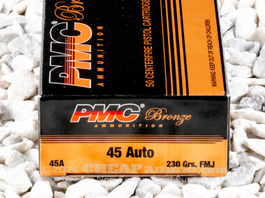 When John Moses Browning created the .45 Automatic Colt Pistol cartridge it was with the intent to come as closely as possible to the Single Action Army .45 caliber that was being phased out in favor of semi automatic pistols. The heavy and slow bullet has proven to be an easy shooting round delivering reassuring affects in defense applications as well as for target shooting. The caliber served in militaries around the world, and even when replaced by the 9mm NATO in the 1980's, many special forces operators continued to choose the .45 acp for its effective results. PMC's 45 ACP loaded with a full metal jacketed, 230 grain round has a muzzle velocity of 830 feet per second and delivering almost 350 foot pounds of energy. It is designed for range and training, but is close to the same characteristics of the round used in the military for seven decades.