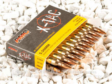 US Continental Army Command began searching for a new rifle round shortly after adopting the 7.62x51 NATO round in 1954. The 7.62 was found to be acceptable as a replacement for the .30-06 but for sustained automatic fire from a handheld weapon still too unwieldly for individual use. The requirements for a smaller cartridge were set forth and Armalite, along with Winchester and obviously Remington, set forth to produce the new round. The result was the .223 Remington, from which the 5.56 was shortly developed and adopted in 1963. The 5.56 is loaded to marginally higher pressure making it not safe to fire from .223 chambers, however, the .223 can be fired from 5.56. The 5.56 full metal jacket by PMC has a muzzle velocity of 3,120 feet per second with 1,189 foot pounds of energy. This is a range training and target shooting round that is also acceptable for competitive shooting.