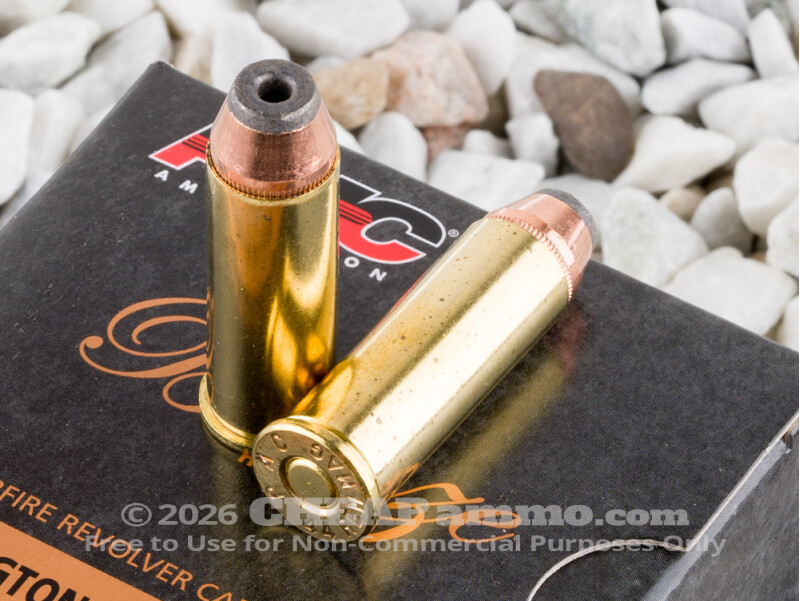 This round’s bullet is a jacketed hollow point, with the rigid copper shell required for deep penetration and the deep nose cavity requisite for wide terminal expansion. The bullet’s flat nose profile inflicts tremendous damage right at impact – and also makes it safe for lever-action firearms, including Henrys.