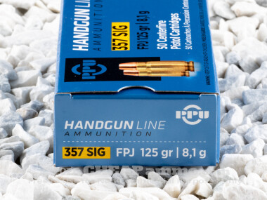 .357 Sig ammunition was developed by Sig Sauer in the early 1990s to create a semi automatic cartridge that duplicates the performance of the .357 magnum. It is one of the most successful bottle necked centerfire cartridge of the later 20th century as it successfully delivered what it was designed to do: superior penetration and, with defensive rounds, transfer of energy into the target. Similar to the .40 S&W, the .357 Sig is a shortened 10mm Auto that was then necked down to a 125 grain for increased pressure while not significantly increasing felt recoil. The full metal jacketed, flat nose round by PRVI has a muzzle velocity of over 1500 feet per second with over 650 foot pounds of energy. This offers impressive penetrative characteristics, but is not considered a defense round as a result. This is for range and training.