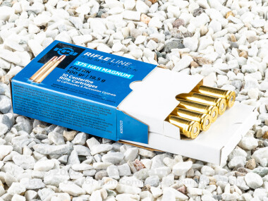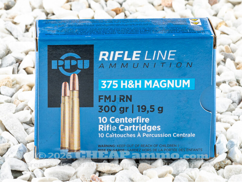 British arms maker Holland & Holland introduced their .375 Magnum cartridge in 1912. It was the second of the commercial belted magnums to rely on the neck instead of the rim to ensure proper headspace seating in the chamber. It was a direct competitor to the German 9.3 Mauser round in African Safari hunting and after World War II was above the minimum caliber requirements many African countries enacted for game hunting. It is famous for being able to take on any game from elephant on down, and trusted for stopping charging animals in their tracks. Another bonus to this caliber is that ballistic trajectories do not vary between different bullet weights, making this a versatile caliber for different game. The 300 grain full metal jacket round by PRVI Partizan achieves a muzzle velocity of 2542 feet per second with 4322 foot pounds of energy. This is a target shooting or training round rather than suitable for game hunting.