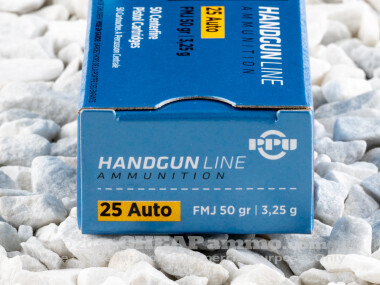 The start of the 20th century saw a movement in the firearms world towards small concealable pistols meant for personal protection. Whether this was a result of social discretion or response to a growing number of laws against carrying (openly or otherwise) can be debated. In 1905 John Browning introduced the .25 Automatic Colt Pistol cartridge as a reliable cartridge for concealable vest pistols yet with greater reliability than .22 Long Rifle rounds: primer compound does not always get uniformly into the entire rim as many RF shooters can attest to the occasional need to double strike. The 50 grain full metal jacket bullet by PRVI has a muzzle velocity of 770 feet per second with 66 foot pounds of energy. It is a training and target shooting round only, ideal for keeping the great many Curios & Relics firearms happily banging away as well as training with the modern mini backups on the market.