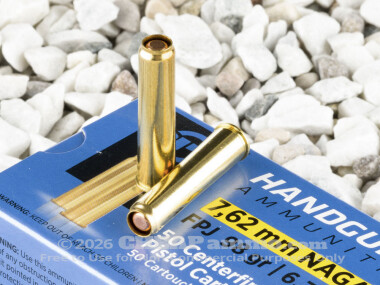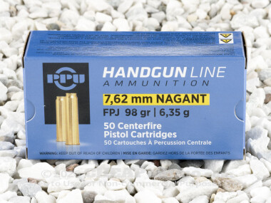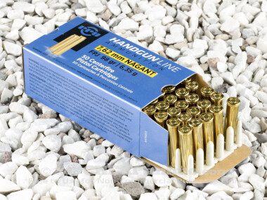 The 7.62x38R[immed] Nagant pistol cartridge is a unique chambering exclusively for the model 1895 military revolver. The bullet is seated inside the case with the edges crimped to hold it in place. The cylinder of the Nagant revolver moves forward when cocked to seat the forcing cone into its face, thus creating a gas seal. That seal is further ensured by the case crimp expanding out with the bullet when it is fired. This design, while a bit more complicated, is reputed to increase muzzle velocity by another 70-100 feet per second with military grade ammunition. It certainly helps reduce muzzle blast between the cylinder and the cone. This also makes the 1895 Nagant one of the few, if only, revolvers suitable for use with a suppressor. The 98 grain flat nosed, full metal jacket bullet by Partizan can leave the barrel at 738 feet per second with 119 foot pounds of energy. This product is designed for target shooting with the C&R firearm.