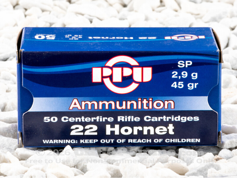 Introduced in 1930, the .22 Hornet is a bottle necked, rimmed cartridge that became the highest performing .22 caliber cartridge for decades until the introduction of the FN 5.7x28. It is a reloadable cartridge capable of various loadings for applications from target shooting to hunting varmints and larger game. It is also the caliber that was selected by the US Air Force for use in their M4/M6 and AR5 survival rifles: in which the usage of expanding bullets for a military arm was in direct contravention of the Geneva Convention. As a result, boxes of the ammunition were specifically marked for hunting purposes only. The 45 grain soft point bullet by PRVI leaves the muzzle at 2427 feet per second with 589 foot pounds of energy. This is a hunting round but is also good for use as a target shooting round for such a rare caliber these days.